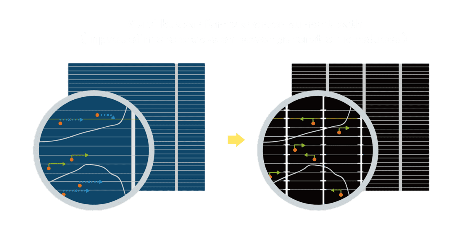 - 电池使用多条铜导线 (Copper wire) 于电池片上形成较短的电流路径,,,提高电流收集效率,,,采用圆形设计的铜导线较传统扁平式的铜焊带 (Ribbon),,,,可增加入射至电池的光线量。。。。