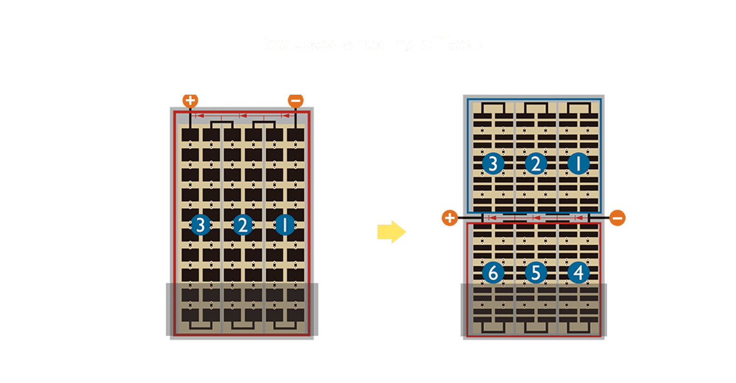 - 结合半切电池,,,,降低遮阴影响、、、、提升模组抗隐裂能力、、、并减少电阻损耗,,,,进一步提升模组发电效能。。