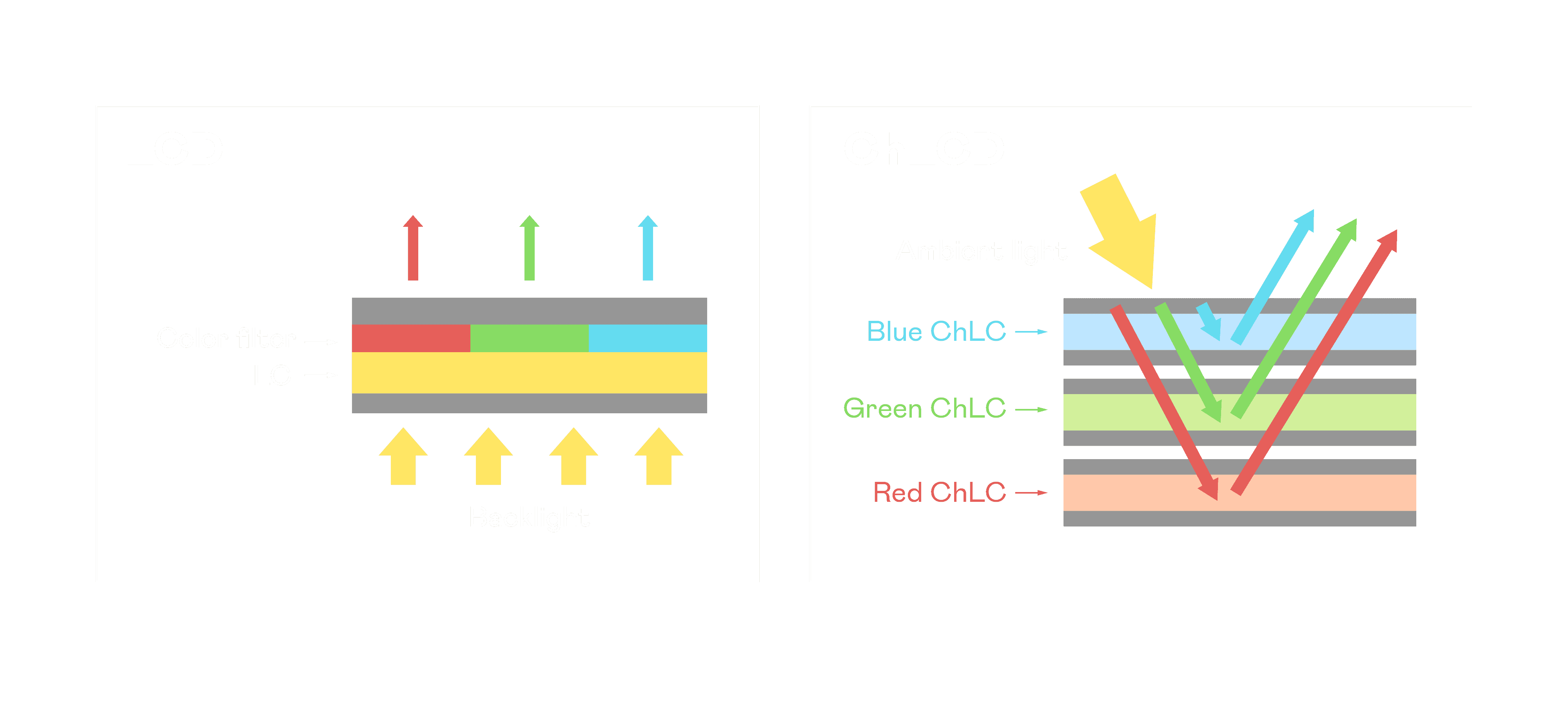 ChLCD 胆固醇液晶就如同纸张一样,,,,透过反射环境光来显示影像,,,因此长时间观看不易造成人眼视觉疲劳,,,可达到护眼效果。。。当处于户外阳光下使用,,LCD 影像容易失真而不易观看,,,,但胆固醇液晶仍可维持较佳的影像品质。。。。